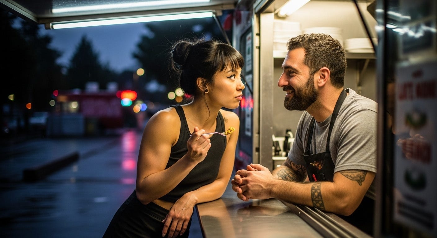 His truck, "Leo's Eats," is parked in the Cartopia pod on Hawthorne. It's become my post-shift ritual. I finish slinging beers for the night, hop on my bike, and head over, usually getting there just as the late-night crowd is thinning out. The dish is insane. Creamy, spicy, with crunchy breadcrumbs on top. It's the kind of food that feels like a sin, and lately, I've been thinking a lot about…